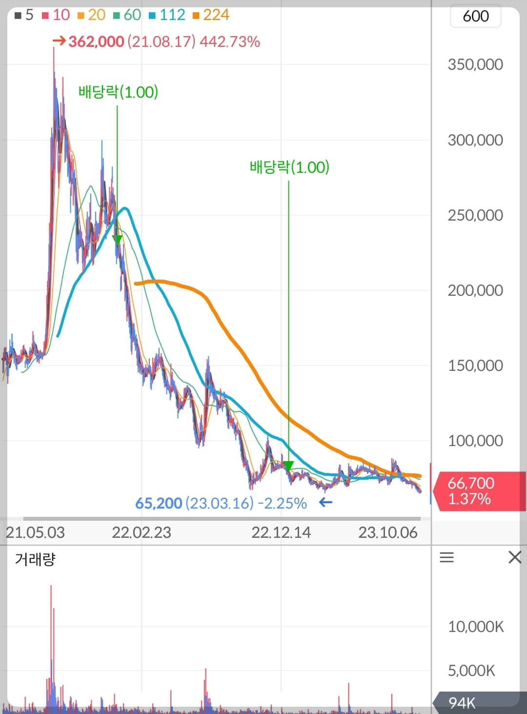 이전 거대한 상승을 보며 저렇게 돌아갈 수 있다고 희망회로를 돌리시는 분들이라면 주식투자를 멀리하시는게 좋습니다. 보통 저런 거대한 이전 상승을 보고 매물대를 느끼며 상승이 제한되었다고 판단하시는 분들이 성공할 가능성이 30,000% 더 높을겁니다.