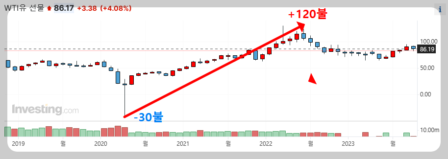 그러다 재차 국제유가가 조정기에 진입하며 2023년 SK이노베이션의 실적은 빠르게 악화되었고 수율문제를 해결하지 못해 여전히 헤매고 있는 SK ON의 대규모 적자는 SK이노베이션의 실적을 강하게 압박했습니다. 1분기 -3,000억, 2분기 -1,300억을 기록했던 SK ON은 3분기에도 - 1,500억 규모의 적자를 기록할 전망입니다. 정말 다행인건 주요 산유국들의 공격적인 감산으로 국제유가가 재차 상승기에 진입했고 이스라엘을 중심으로 중동국가간의 갈등이 재점화되며 국제유가가 금일 한국시간 07:00에 86$까지 급등한 상황입니다.