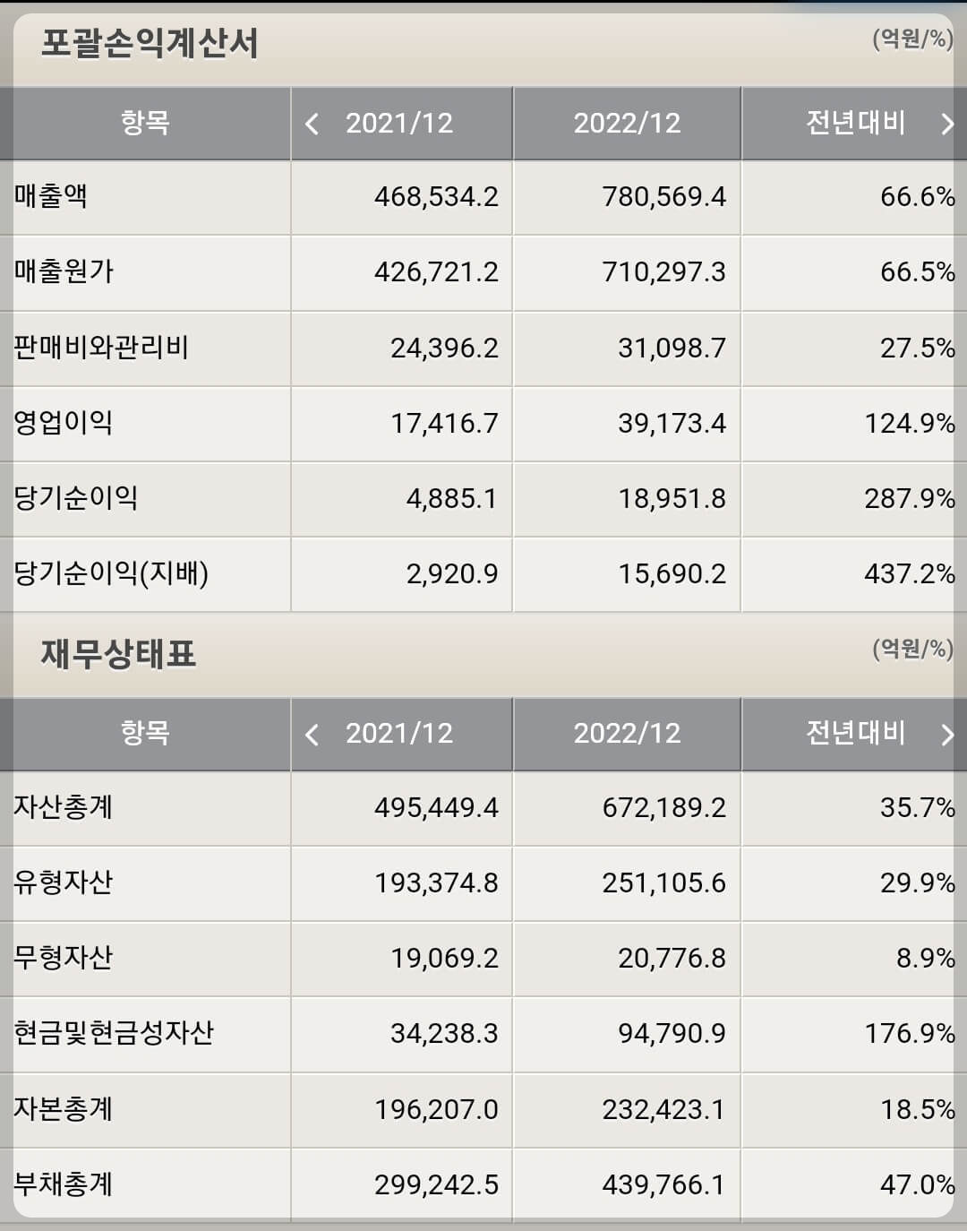 양심은 명백하게 0점이고 2차전지 수율 문제를 해결하지 못해 대규모 적자에서 벗어나지 못하는 모습을 보면 실력도 0점이지만 다행히 국제정세가 정유 섹터에게 유리한쪽으로 흘러가며 적자전환은 면할 것으로 보여 운은 꽤 좋아 보입니다. 최근 전기차 판매 수요가 굉장히 둔화되며 2차전지 ASP가 하락하고 있고 미국 조지아 공장 화재까지 발생해 SK ON의 흑자전환은 아직도 미지수에 머물러 있습니다. 현재 자본 대비 부채비율이 높아지고 있고 지속적인 현금 조달이 필요해보이는 상황은 재무적으로도 부정적인 요소입니다. 따라서 SK이노베이션의 재무 부문 종합등급은 C등급으로 평가하겠습니다.