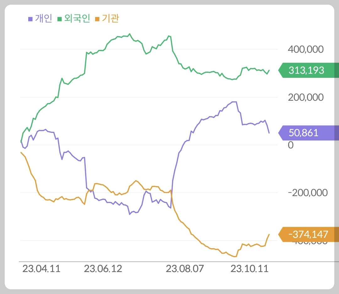 - 개인 500억 매수, 외국인 3,131억 매수, 기관 3,741억 매도