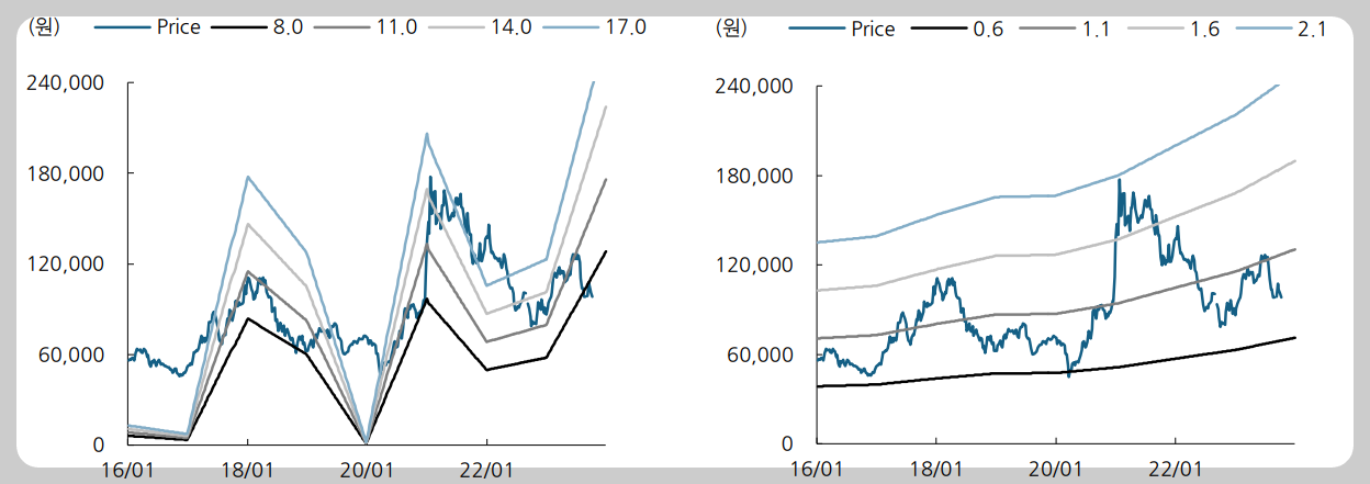 LG전자는 기업가치 훼손 없이 감익 사이클에 의해서 주가조정을 받고 있기에 현재 주가는 밸류 부담이 매우 적다고 판단됩니다. 따라서 LG전자의 목표 주가는 평균 PER 11배를 기준으로 설정하였습니다. 다만, 최근 시장으로부터 주목받는 섹터가 아니다 보니 본격적인 성장이 확인되기 전까지는 탄력적인 주가 상승까지는 시간이 좀 필요할 것으로 예상됩니다.