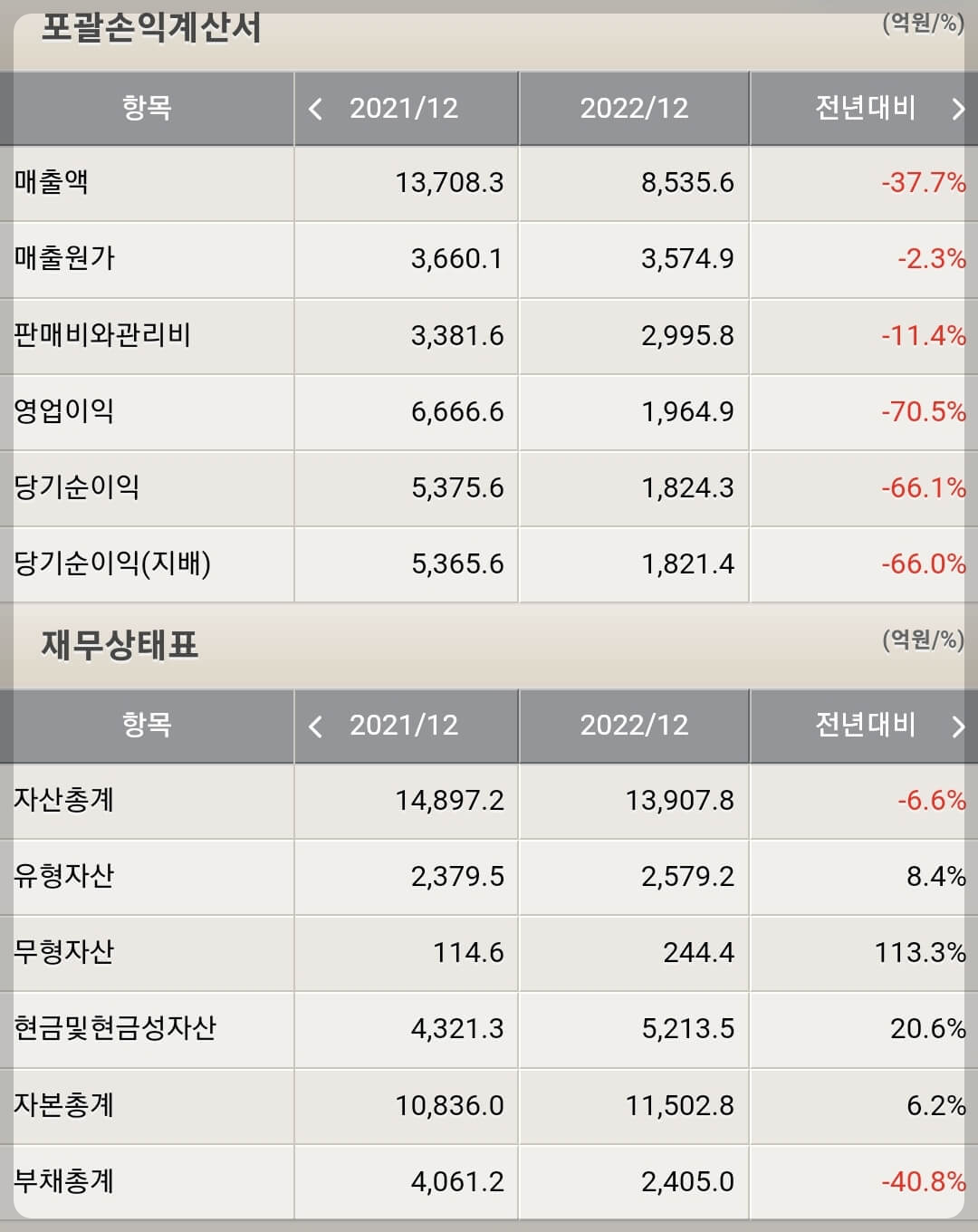 - 코로나 종식, 매출 및 영업이익 급감 ▼ 주가 20,000원대 하락