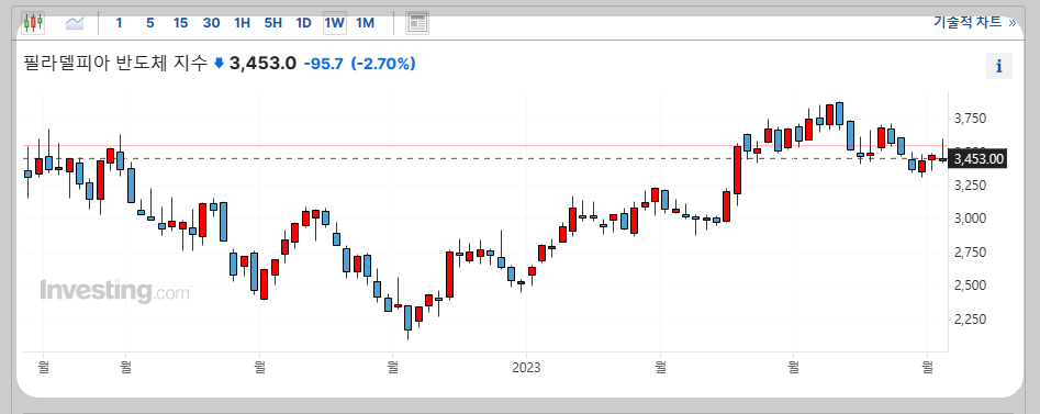삼성전자는 현재 개별 종목장세를 주도할만한 실적 모멘텀이 부재한 상황이기에 필라델피아 반도체 지수와 매우 흡사한 주가 흐름을 보여주고 있습니다. 미국 연준의 고강도 재정 긴축으로 위험 자산에 대한 투자 심리가 급격하게 얼어붙으며 하락하다 금리 동결에 대한 기대감과 AI 시장 개화 기대감으로 나스닥 지수와 필라델피아 반도체 지수가 급반등이 나와주었기에 코스피를 대표하는 삼성전자의 주가도 유의미한 반등에 성공한 것입니다.