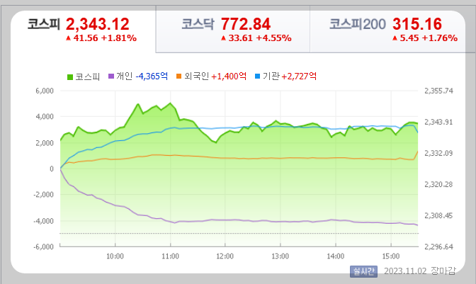 시장은 아래와 같이 폭발적인 상승을 보여주며 파월의 발언에 환호했습니다. 고통스러운 금리 인상에 대해 우려하지 않아도 될 것이라는 응축된 기대감이 증시에 반영된 것이죠. 국내 증시도 미국증시의 폭발적인 상승에 코스피 1.8%, 코스닥 4.55% 상승했습니다.