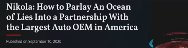 미국의 한 행동주의 리서치 회사에서 니콜라의 주식을 대량으로 공매도를 친 후 니콜라의 거짓말을 밝히겠다며 위와 같은 보고서를 발표했습니다. 당시 니콜라는 수소자동차 설계 회사로 제 2의 테슬라 탄생을 기대하는 투자자들의 기대심리로 막대한 멀티플을 받아 글로벌 완성차 기업인 포드와 도요타의 시총을 넘어섰습니다.