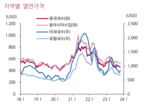 단기적으로 열연가격과 리튬가격의 반등이 나올 가능성이 크지 않기에 단기 실적모멘텀은 크지 않지만 내년 하반기로 예상되는 금리인하 시점에 시장유동성이 증가하며 철강제품 ASP 가격이 상승할 것으로 보고 있고 전기차 전환 속도가 더뎌지긴 했지만 방향에 대한 의심은 전혀 할 필요가 없는 상황이므로 미래 기대감은 여전히 유효하다는 판단입니다.