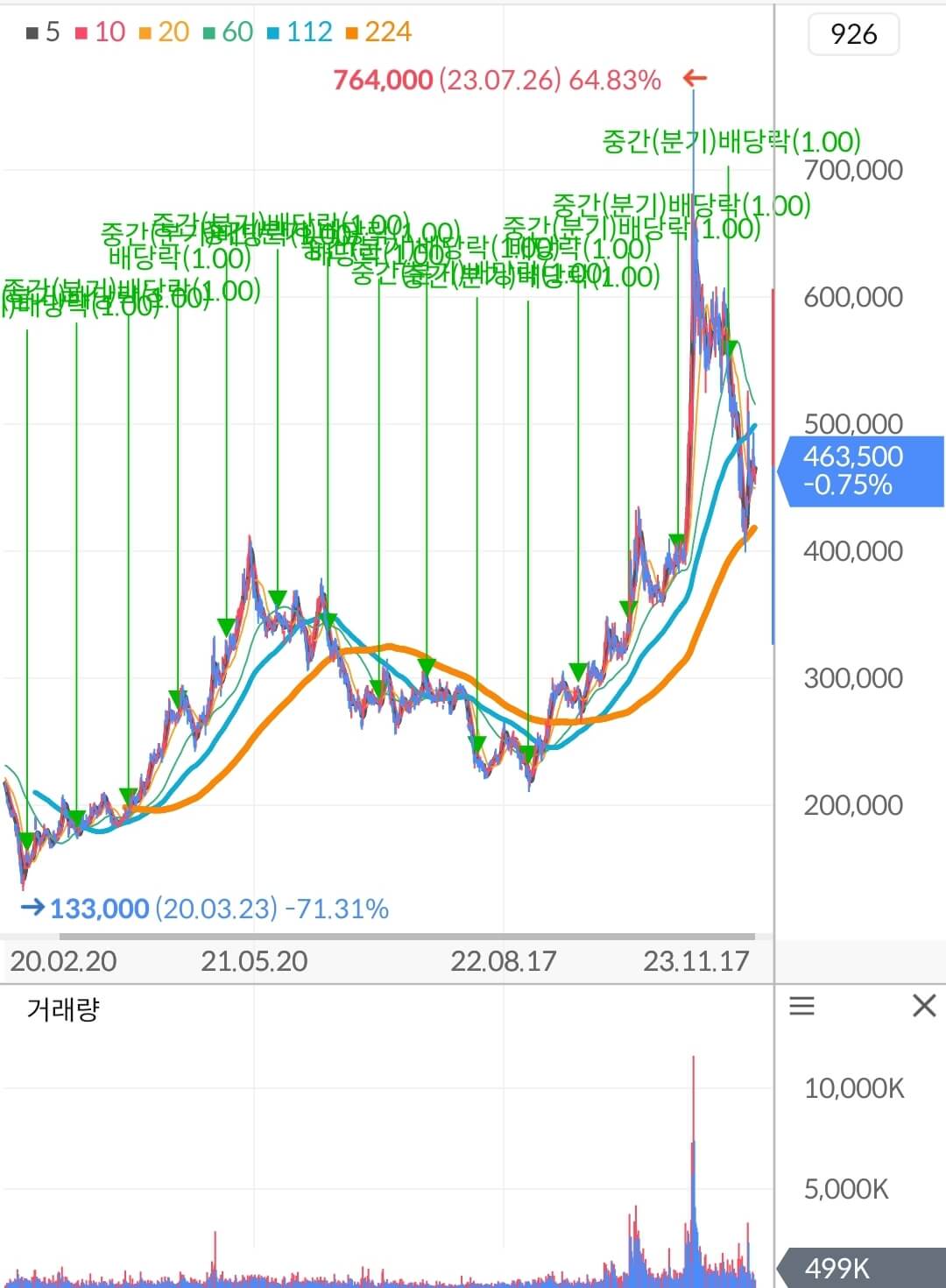 폭발적인 주가상승이 시작되었던 400,000원 구간은 224일선 이평선에서 잘 지켜내었습니다. 다만, 단기 고점에서 높은 수준의 거래량이 발생하며 급락했기에 매물대 부담은 상당할 것으로 보입니다. 따라서 리스크 관리하시면서 긴 호흡으로 대응하시길 바라겠습니다.