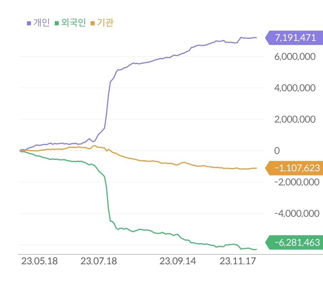 - 개인 7.1조 매수, 외국인 1.1조 매도, 기관 6.2조 매도