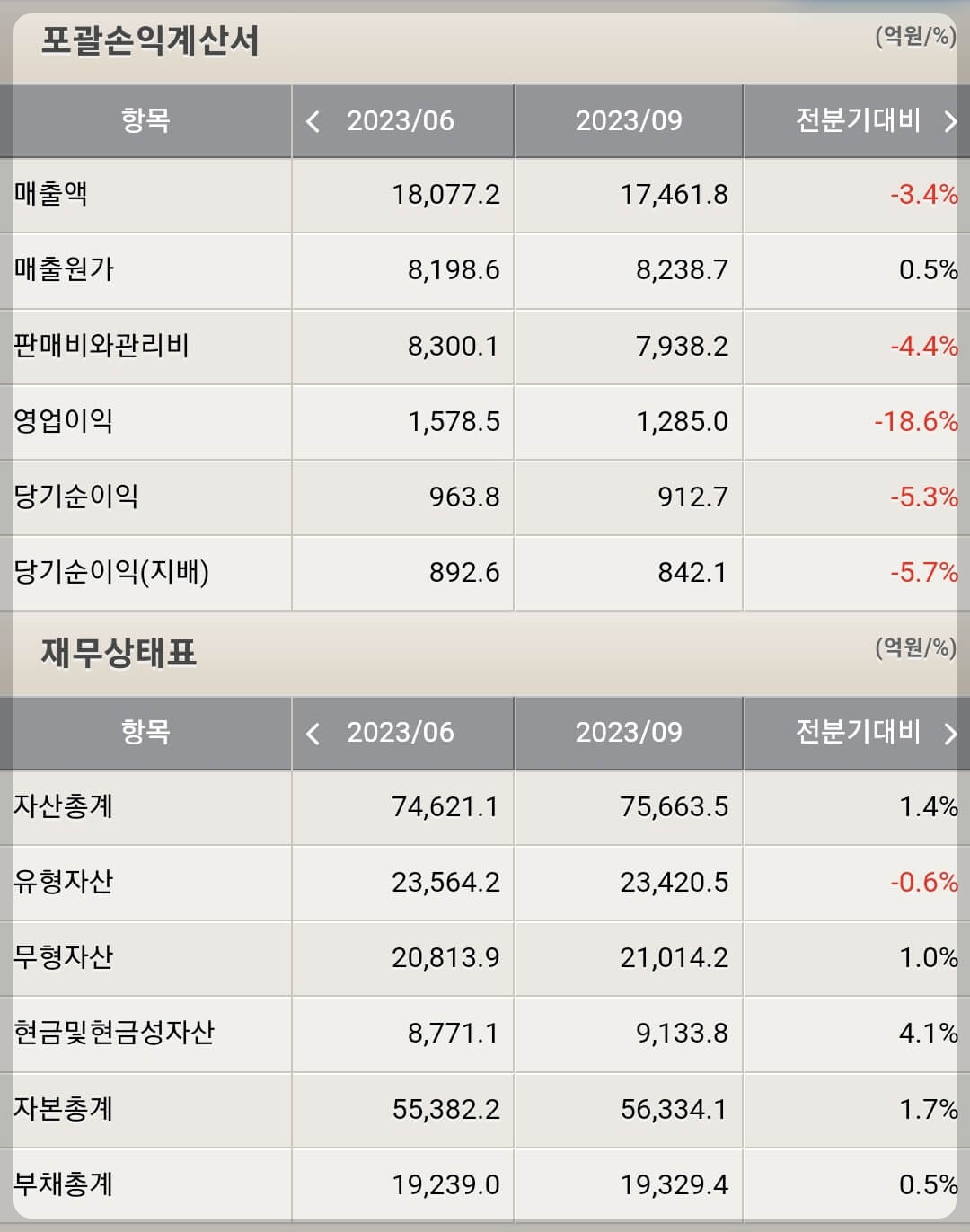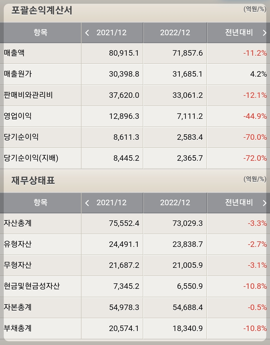 - 화장품 : 80억 (매출 : 6,700억)