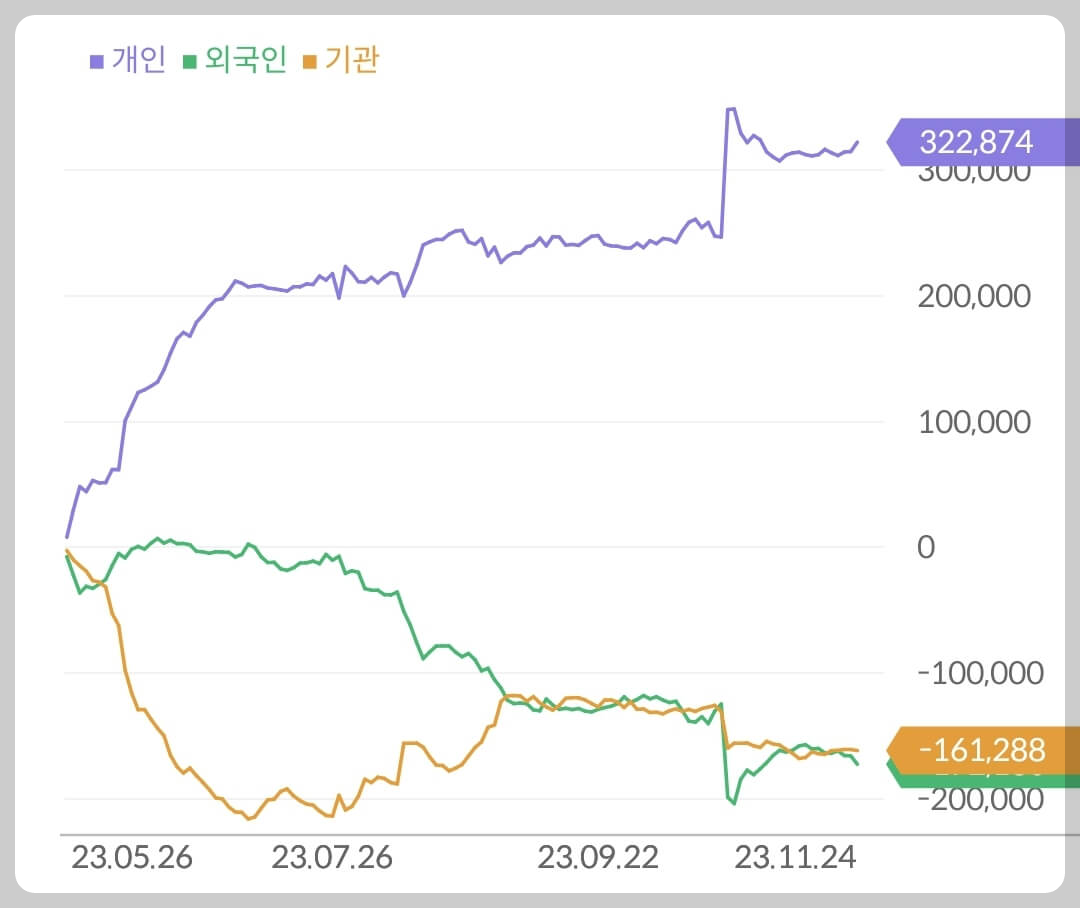 - 개인 3.2조 매수, 외국인 1.6조 매도, 기관 1.7조 매도