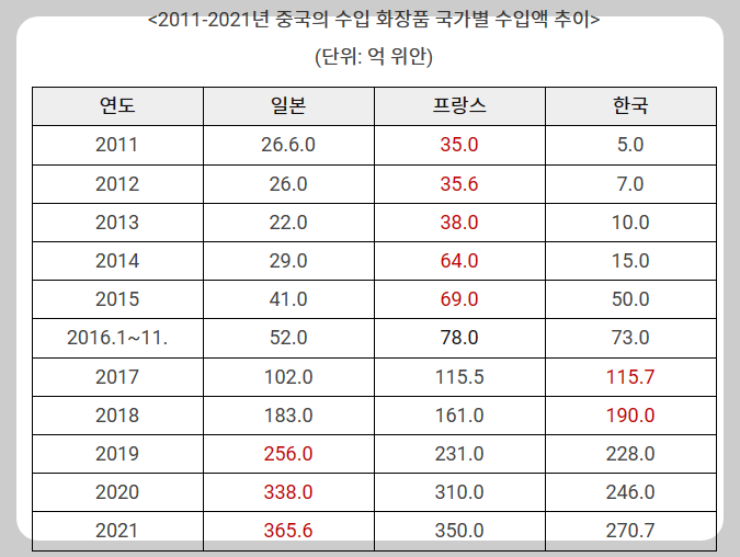 - 2017년 이후 한국 화장품이 중국 시장에서 크게 인기를 얻으며 수입액이 급증했습니다.