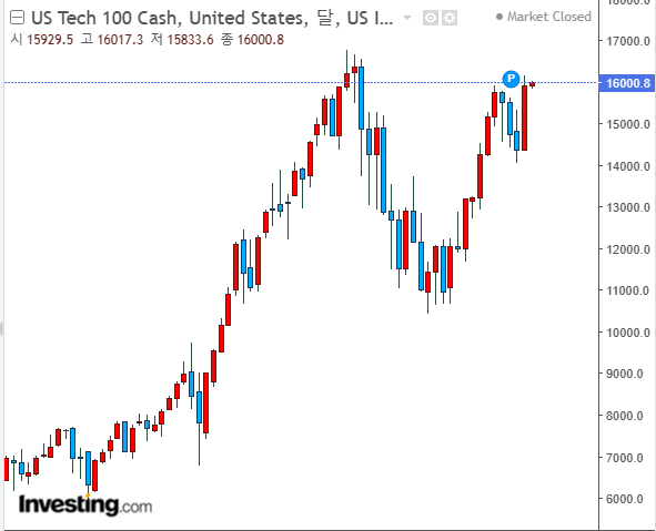 대한민국은 인구수가 적고 자원이 없어 수출 중심의 기술주들이 시가 총액 상위를 차지하고 있고 최근 실적 모멘텀도 부재한 상황이라 나스닥 지수의 흐름을 추종할 가능성이 매우 높다고 말씀드렸었습니다. 그렇다면 아래 나스닥 월봉 차트를 보겠습니다.