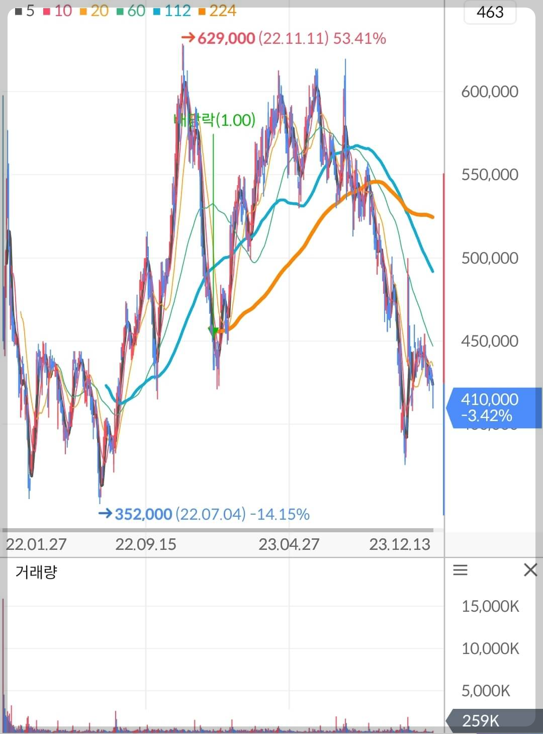 - 전기차 시장 캐즘 구간 진입에 따른 수요공백 발생 ▼ 주가 410,000원대 하락
