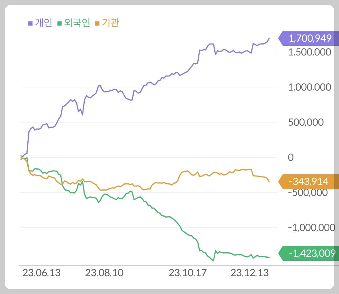 - 개인 1.7조 매수, 외국인 0.3조 매도, 기관 1.4조 매도