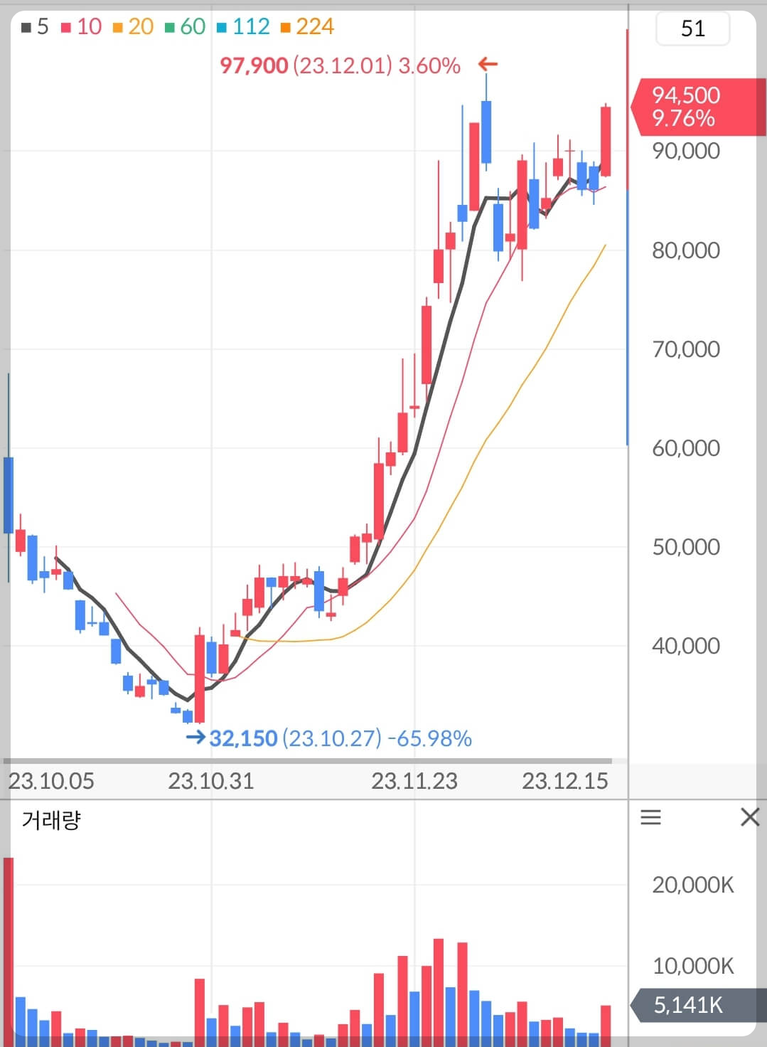 - 전 고점 돌파하며 추세상승 흐름 지속 ▲ 주가 94,000원대 상승