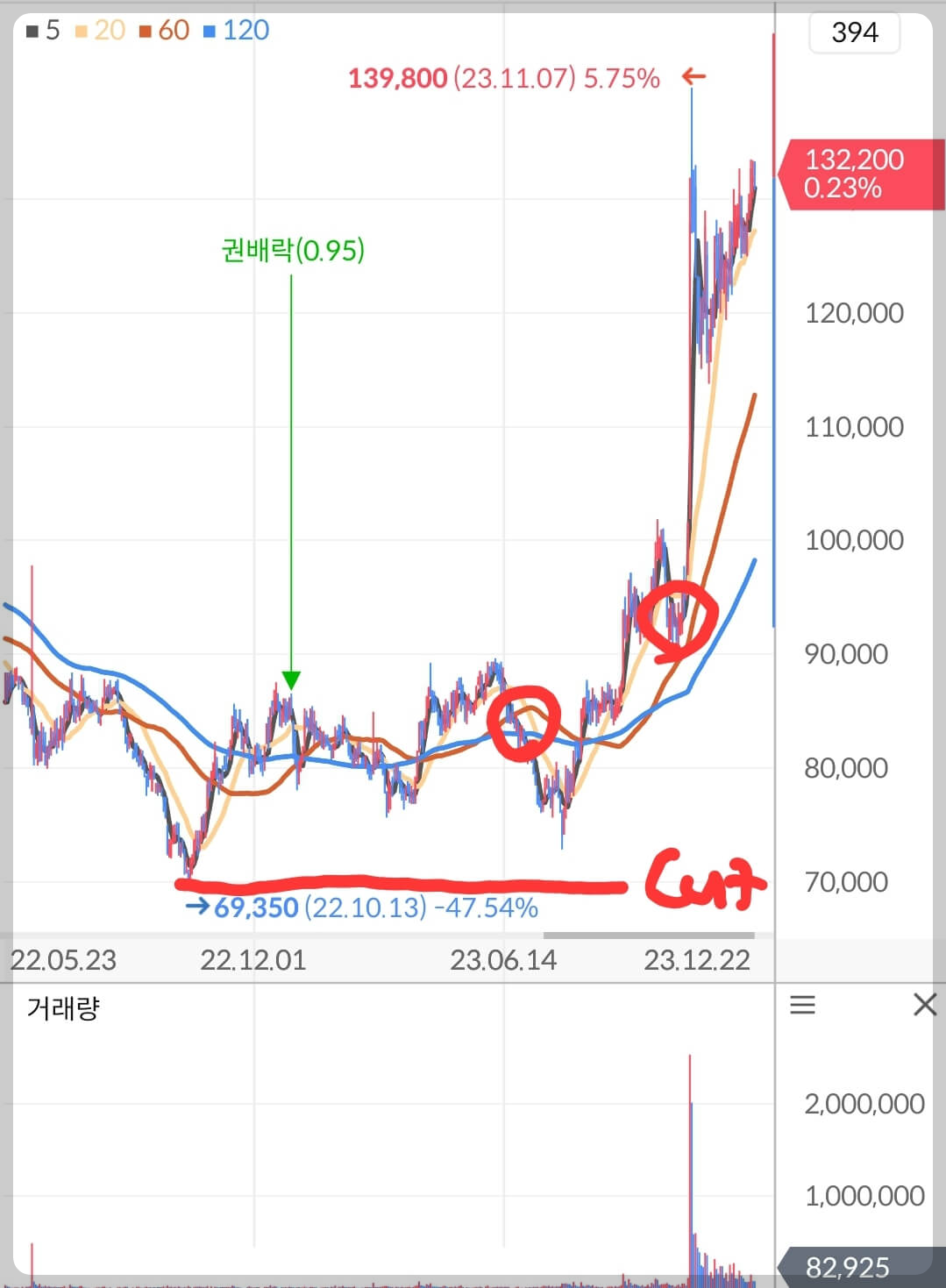 제가 지난 글에서 하락추세에서 상승추세로 전환되는 종목의 투자기준을 설명드렸었죠. 다시 한번 간단하게 설명드리면 20일, 60일, 120일선이 역배열에서 모두 정배열되는 골든 크로스가 나온 이후에 주가가 이평선까지 눌러준다면 매수하고 손절은 이전 저점을 이탈할 시 시행하면 된다고 말씀드렸습니다. 익절은 추세 상승이 나온 뒤 단기 이평이 장기 이평을 돌파하려는 움직임이 나온다면 분할익절을 시작합니다. 자세한 내용은 아래 글 링크를 클릭해 확인하시기 바라겠습니다.