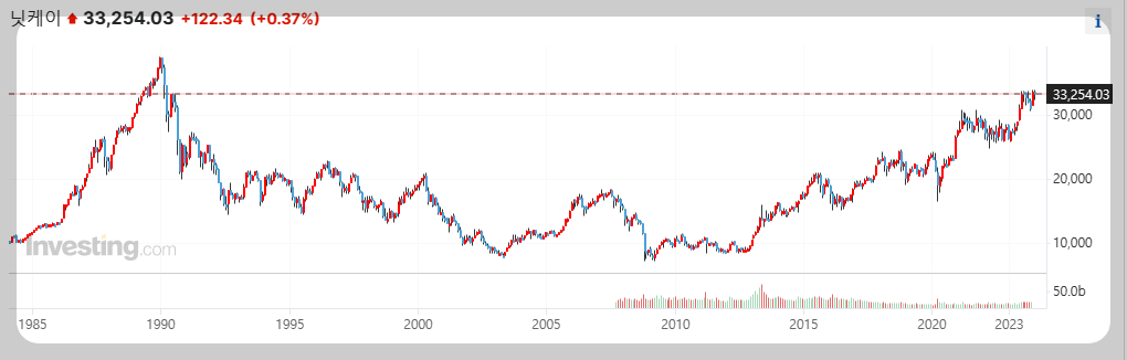 굳이 더 자세한 설명을 하지 않고 차트만 봐도 유독 한국지수인 코스피의 우상향 각도가 가장 완만하다는 것은 확인할 수 있습니다. 일본의 경우 1980년대 전 지구를 다 사버릴 수 있을 정도의 경제 대호황을 누린 뒤 버블이 터지면서 장기침체에 진입했기에 다른 국가의 증시와는 다른 모양을 보여주고 있는데, 그런 일본조차 최근 지속적으로 고점을 갱신하며 역사적 고점에 도전하고 있는 모양새입니다.