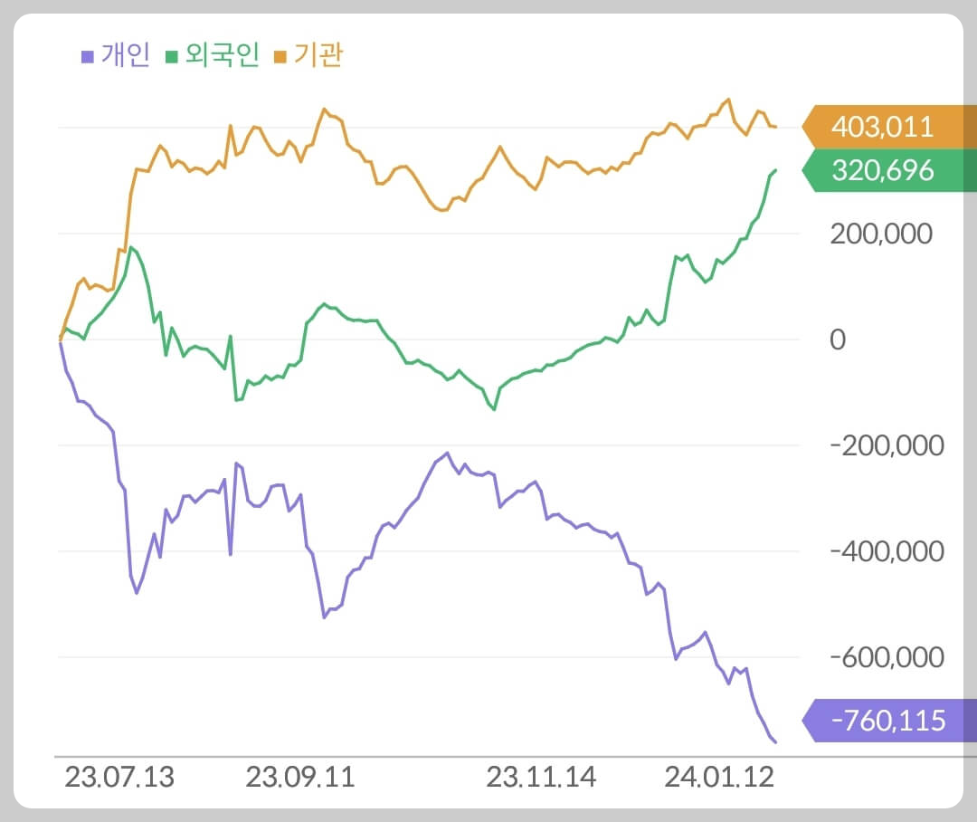 - 개인 7,600억 매도, 외국인 3,200억 매수, 기관 4,030억 매수