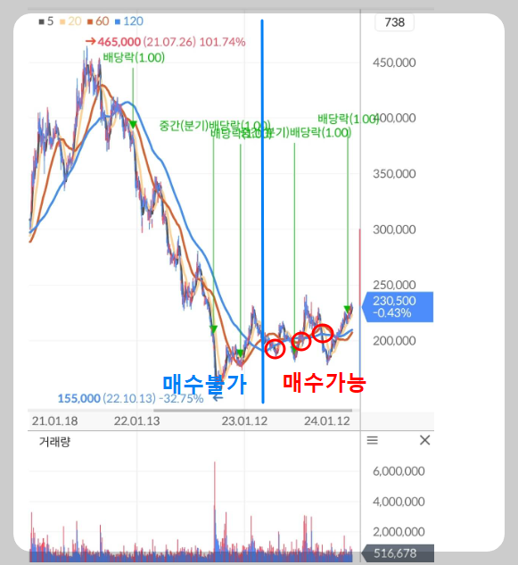 이제는 말씀 안 드려도 잘 아실 겁니다. 추세가 하락하는 종목은 매수로 대응하지 않습니다. 21년도 하반기부터 23년도 4월까지는 NAVER의 매수를 고려할 필요가 없는 것이죠. 하지만 그 이후 120일선이 우상향으로 방향을 틀면서 모든 이평선이 정배열되었고 이익도 방어되고 있음이 확인되었으니 주가가 이평선 부근까지 눌러줄 때마다 매수로 대응할 수 있었습니다. 기준대로 대응했다면 평단가는 약 18~20만 원일 것이며 현재 수익률은 15~20%일 겁니다. 손절선은 기준대로 16만 원으로 설정했고 손실률은 10~20%입니다. 손익비는 최소 1:1 이상으로 설정하되 본인이 설정한 손익비에 따라서 익절 하면 됩니다.