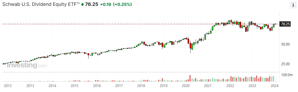 배당률은 그때 그때 다르지만 주가 기준 시가 배당률은 약 3.5% 수준입니다. 상승률은 2014년 당시 35불이었고 현재는 76불입니다. 확실히 성장주인 QQQ 보다는 수익률은 크게 떨어지지만 배당이 꾸준히 들어오고 2014년에 매입한 수량의 경우 시가 배당률이 7%가 넘겠죠. SCHD는 안정성을 높여주고 꾸준한 배당으로 재투자를 할 수 있는 현금흐름을 만들어준다는 장점이 있습니다.