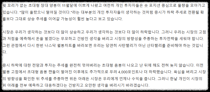 위에서 보셨겠지만 작년 하반기부터 꾸준히 시장의 상승에 대해 의심하지 말라고 믿음을 심어드리려고 노력했고 하찮은 시장참여자 중 한명인 주제에 감히 시장의 고점을 예측하고 숏몰이하는 선무당들에게 휩쓸리지 마시라고 경고도 해드렸습니다.