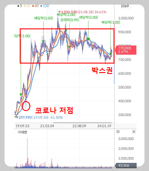 사실 삼성바이오로직스를 조금씩 모아가라고 말씀드린 지 꽤 오랜 시간이 지났습니다. 저처럼 상장초기부터 투자하신 분들이 아니라면 아직 큰 수익은 아니실 거라고 생각하지만 일희일비하지 마시고 꾸준히 박스권 하단에서 모아가시는 것을 추천드립니다. 대한민국 증시는 형편없는 주주환원정책과 후진적인 기업마인드로 유상증자, 물적분할 등이 유행인 곳이기에 박스권에 갇혀있을 수밖에 없습니다. 따라서 미국주식처럼 무조건 보유하는 것이 수익을 극대화할 수 있는 전략이 절대 아닙니다. 하지만 삼성바이오로직스는 대한민국 바이오섹터에서 트레이딩 없이 모아갈 가치가 있는 거의 유일한 기업이라는 판단입니다.