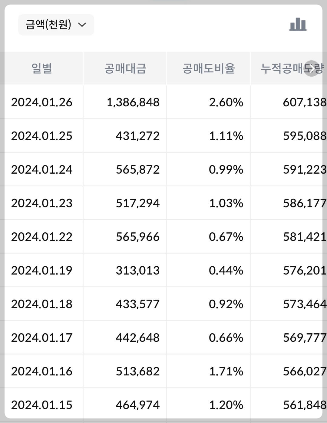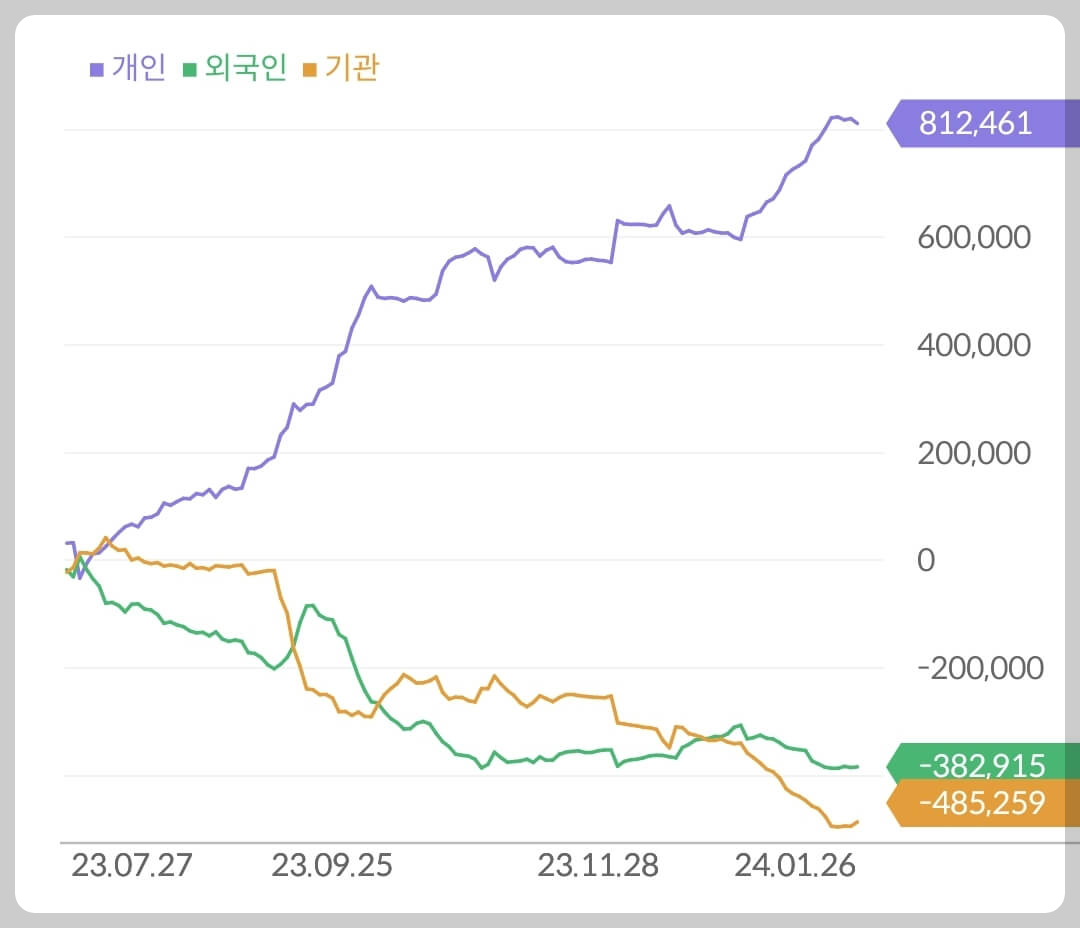 - 개인 0.8조 매수, 외국인 0.38조 매도, 기관 0.48조 매도