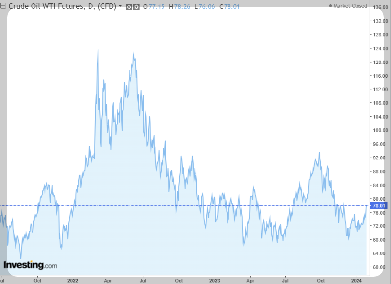 그럼 마지막으로 SK이노베이션의 운을 보겠습니다. SK이노베이션이 작년 배터리 부문 엄청난 적자에도 1.9조의 흑자를 기록할 수 있었던 건 정유 사업 덕분이었습니다. 2023년 하반기부터 중동지역의 지정학적 리스크가 부각되면서 국제유가가 가파르게 상승했고 덕분에 정제마진도 상승하며 2023년 3분기에만 정유부문 1.5조 원의 영업이익을 기록할 수 있었습니다.