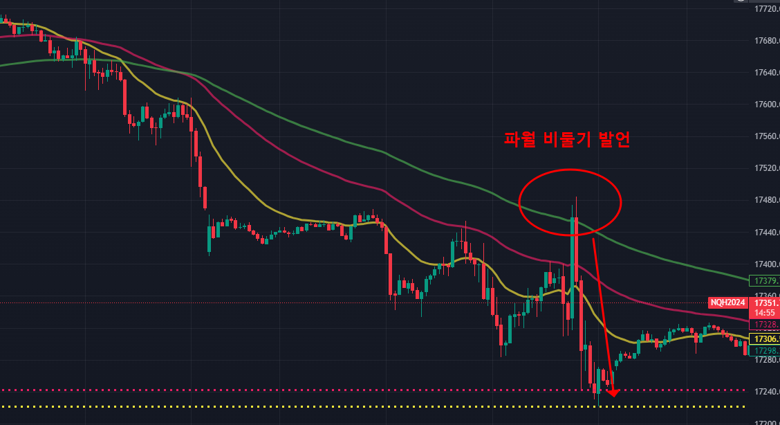 나스닥 지수를 보면 구글, AMD 등 빅테크들의 부진한 실적으로 단기 하락추세에 진입한 상황에서 미 연준의 파월이 시작되자 그의 비둘기 발언에 환호하며 엄청난 급등을 보여주었습니다. 하지만 이내 3월 금리 인하 가능성에 대해 일축하는 그의 발언이 나오자 시장은 실망감을 드러내며 단숨에 폭락했습니다.