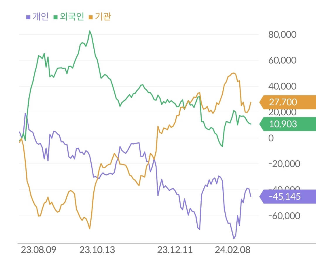 - 개인 451억 매도, 외국인 100억 매수, 기관 270억 매수