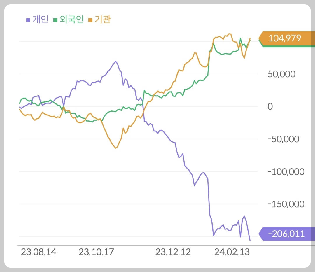 - 개인 2,000억 매도, 외국인 1,000억 매수, 기관 1,000억 매수