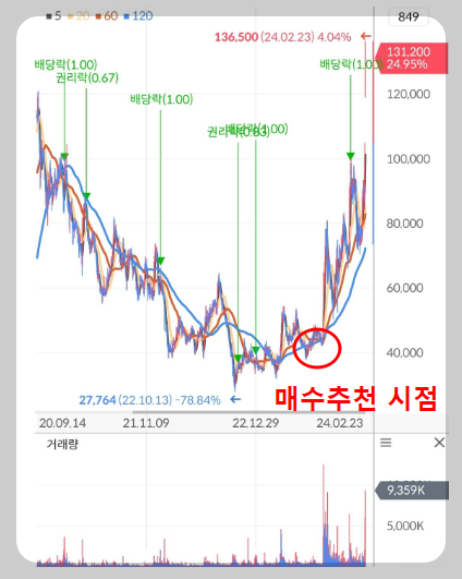 당시 목표가로 100% 익절가인 80,000원을 설정했는데 현재 알테오젠의 주가는 13만원을 넘어 무난하게 목표가를 달성하였습니다. 이렇게 추세전환 시그널이 나온 뒤에 매수를 하셔야 손절선이 명확하고 큰 기다림없이 이익을 실현할 수 있다는 점 다시 한번 강조드려 말씀드리고 싶습니다.