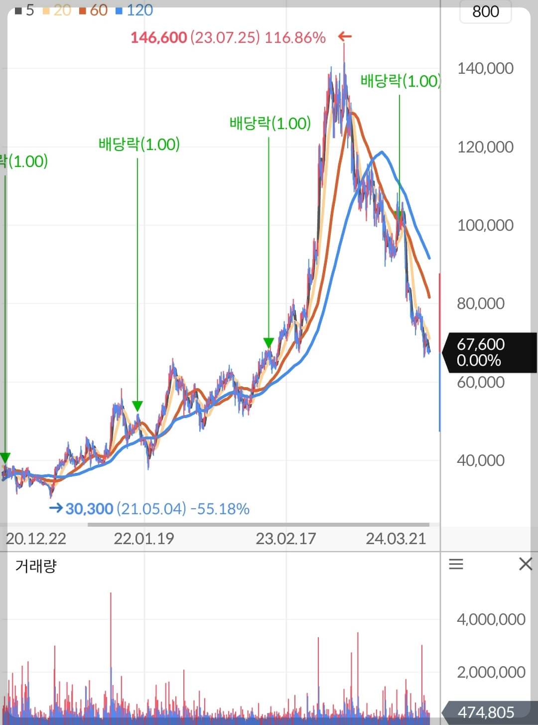 장기간의 주가 우상향을 이어온 기업의 주가가 급격하게 상승하며 이평선간의 이격을 크게 벌린 상황에서는 절대 추격매수해서는 안되며 이평선이 역배열된 시점에서는 익절 또는 손절을 반드시 고려하셔야 합니다. 손익비가 좋지 않은 추격매수를 했음에도 손절을 고려하지 않는다는 건 시장에 언제든 내 목을 가져가라고 내놓는 거와 다를 게 없습니다.