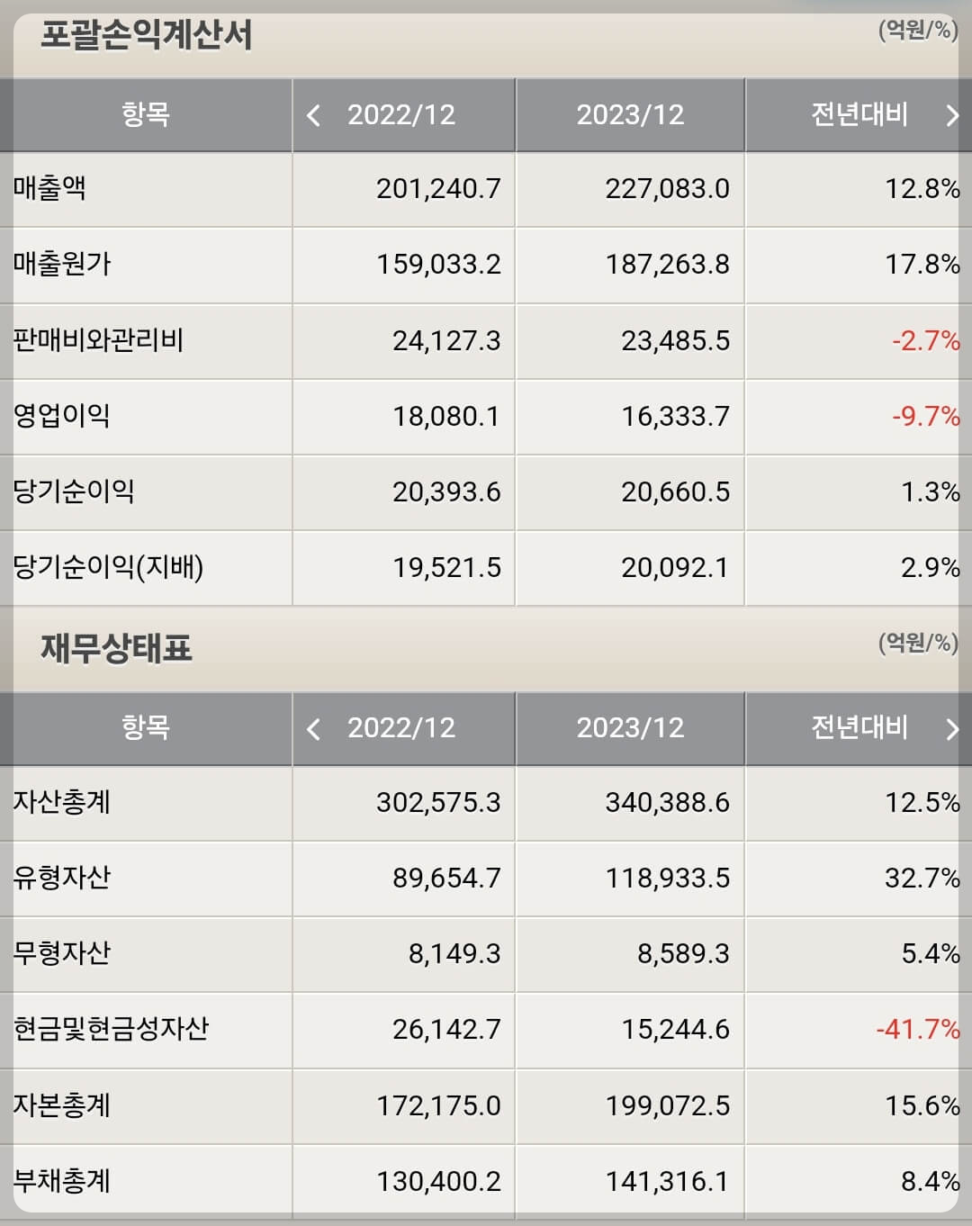 하지만 삼성SDI 23년도 3분기 실적을 보면 영업이익 4,910억 중 무려 2,300억을 EV 2차 전지에서 달성했는데, 창사 이래 최초로 EV 2차 전지 부문에서 분기 영업이익 2,000억 돌파를 성공했습니다. 원자재 가격 하락과 중국산 LFP 점유율 확대, 전기차 수요 부진으로 ASP가 훼손되며 2차전지 기업들이 어려움을 겪고 있는 와중에 삼성 SDI의 2차 전지 영업이익률은 8.5%로 글로벌 최상위권 수준을 기록하고 있습니다. 23년도 4분기 실적에서는 수요 부진에 따라 배터리 가격이 하락하며 수익성이 악화되었지만 영업이익 3,118억으로 상대적으로 잘 방어해낸 모습입니다.
