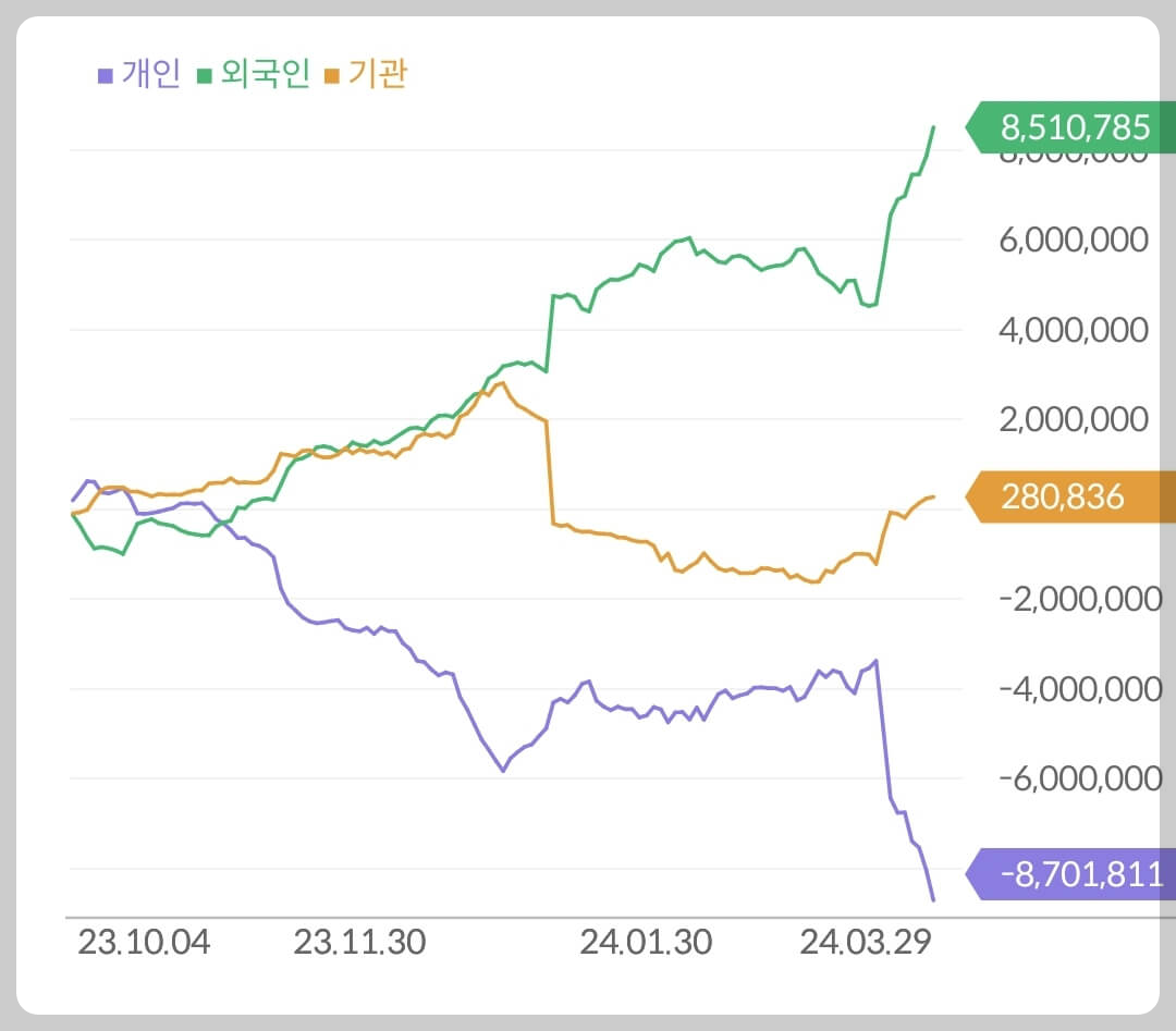 삼성전자의 주가 상승은 반도체 섹터의 좋은 흐름과 엔비디아 CEO의 립서비스 등 다양한 요인이 있었습니다만 외국인들이 코스피 선물시장에서 선물을 쓸어 담으며 강한 매수 포지션을 구축한 것도 중요한 요인으로 판단됩니다.