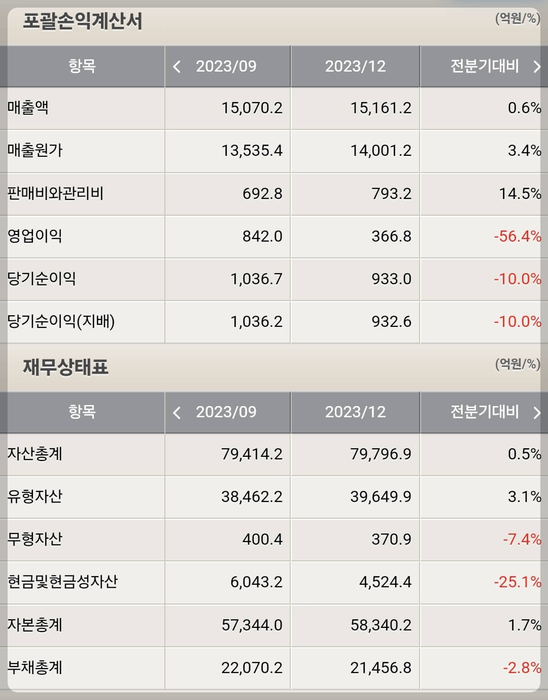 하지만 업황이 그렇다는 것이고 금호석유는 이런 최악의 상황에서도 작년 3,600억의 영업이익을 기록했고 50% 미만의 부채비율을 유지하며 최고의 재무건전성을 확보하고 있습니다. 올해에도 작년과 비슷한 수준의 영업이익을 예상할 수 있으며 탄탄한 재무건전성을 바탕으로 자사주 소각 및 현금배당을 준비함에 따라 밸류업 프로그램의 수혜주로 분류되기도 했습니다.