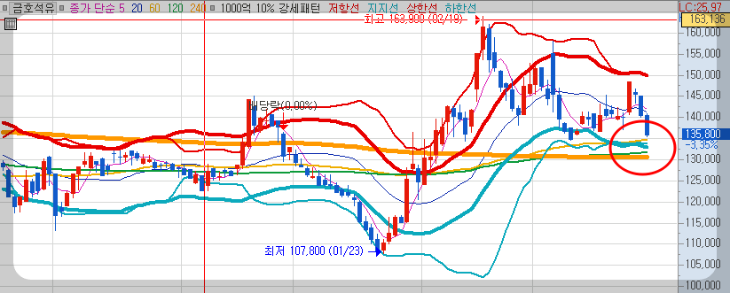 현재 금호석유의 밸류에이션은 크게 부담스럽지 않고 주가 하단에 이평선과 엔벨로프, 볼린져 밴드 하단선까지 밀집되어 있기에 단기적인 투자는 가능해 보입니다. 하지만 투자하시더라도 길게 보는 것보다는 10% 내외로 이익 실현을 하시는 걸 추천드립니다. 저 역시도 해당 구간에서 지지받는 모습을 보여준다면 작은 비중으로 투자하여 7~10% 수익을 목표로 할 예정입니다.