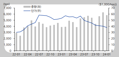 2023년 4분기 적자로 걱정하시는 투자자들이 많으시겠지만 이는 재고평가손실로 인한 것으로 올해부터는 추가 ASP 하락으로 인한 재고평가손실이 크지는 않을 것으로 예상합니다. 또한 SK ON에 납품하는 NCM 양극재는 부진하겠지만 삼성 SDI에 공급하는 NCA 양극재 수요는 견조할 것으로 최소한의 이익방어는 가능할 것으로 보입니다.