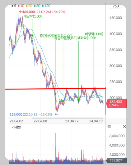 NAVER는 22년 하반기 과대낙폭을 받아내고 24만원 부근까지 주가를 끌어올렸지만 과대낙폭이라는 모멘텀만으로 주가를 우상향으로 이끌고 가기엔 턱 없이 부족했습니다. 주가의 기본적인 성질은 평균으로 회귀하는 것입니다. 그런데 그 평균을 극복하고 특정 방향으로 치고 나가기 위해서는 추가적인 힘이 필요한데 그 힘은 바로 기대감입니다.
