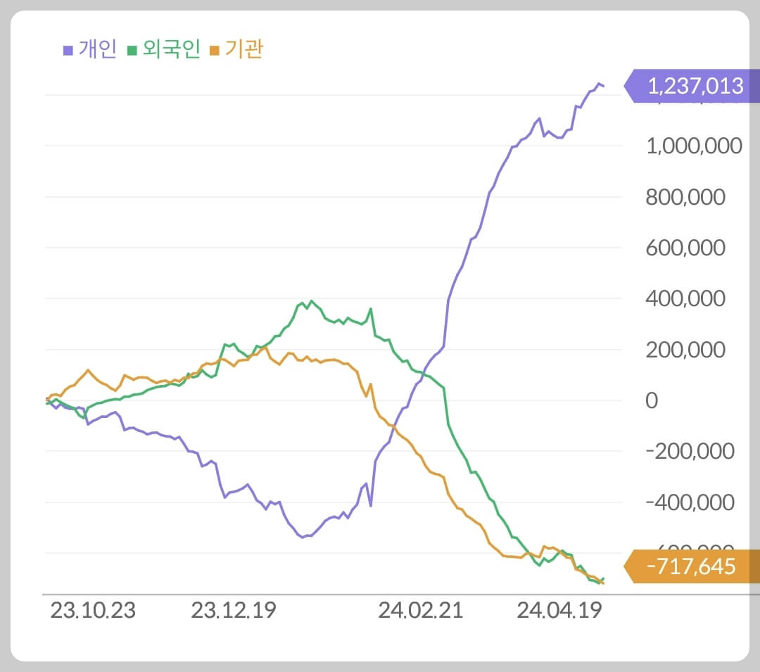 저 역시도 하락하는 우량주를 거래하는 경우가 있습니다. 기업의 본질적인 가치는 훼손되지 않았지만 전체적인 시장 분위기로 인해 주가가 급락하는 경우 엔벨로프를 활용하여 과대 낙폭을 잡아내는 매수를 하고 있습니다. 하지만 NAVER는 엔벨로프 기준에도 부합하지 않고 있고 딱히 투자할 수 있는 근거가 명확하지 않은 상황이지만 연일 외국인 및 기관 투자자들이 리스크 관리 차원에서 던지는 물량을 개인 투자자들이 전부 받아내고 있는 상황입니다.