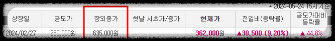 "장외 종가 대비 50% 하락, 공모가 대비 44% 상승"
