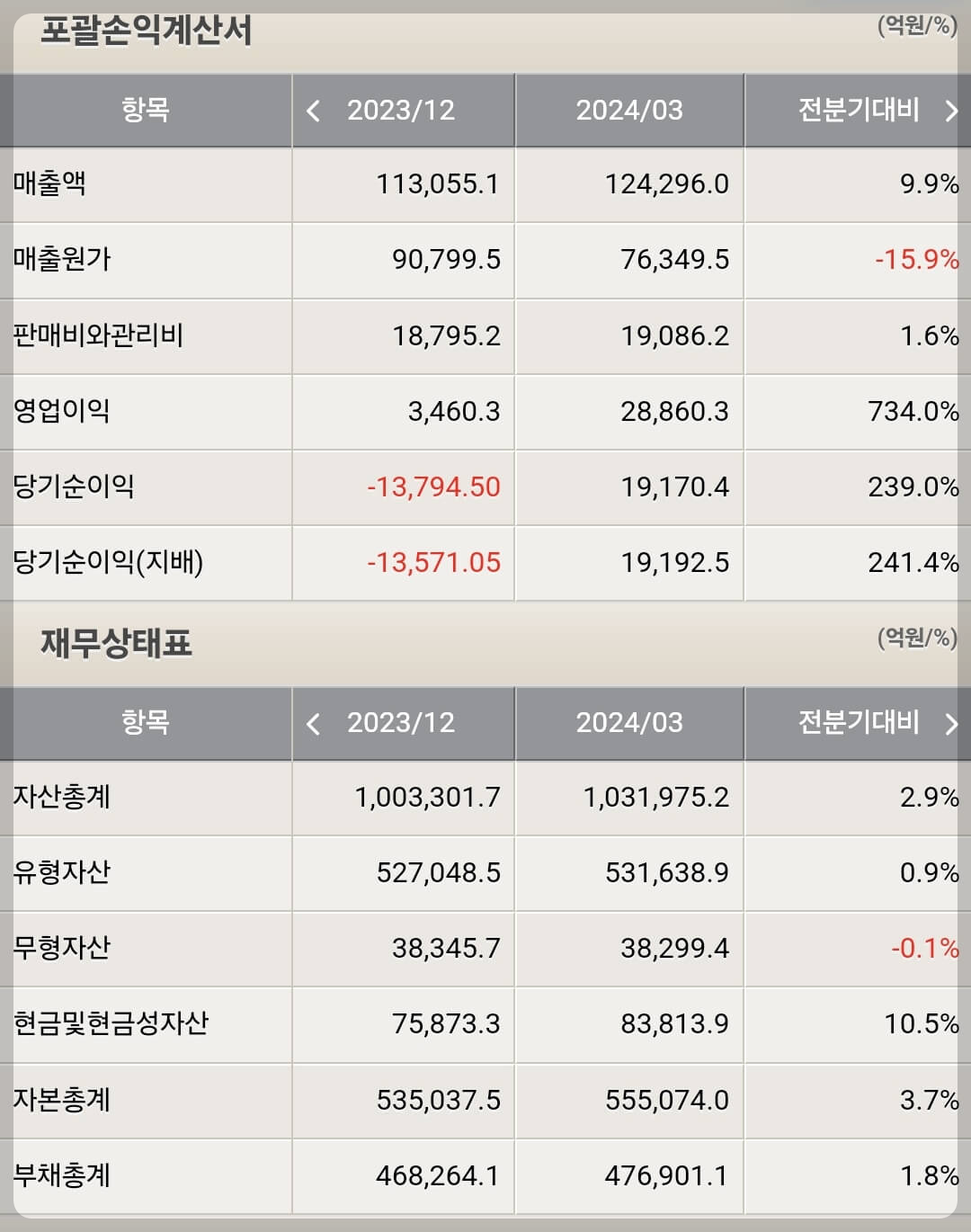 위 내용 그대로 현실화되며 SK하이닉스의 24년 1분기 매출액은 12.4조 원, 영업이익 2.88조 원으로 높아진 시장의 눈 높이를 상회하는 어닝 서프라이즈를 기록했습니다.