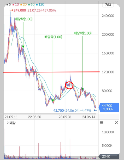 그러다 처음 목표가를 드린 게 빨간색 원으로 표시한 지점이죠. 6월 2일이었을 겁니다. 해당 자료 찾아보시면 일단 주가 하락을 멈춰 돌려세우고 추세전환 의지는 드러냈기에 주가 상승이 지속될 가능성은 있지만 철저하게 탈출의 기회로 접근해야 한다고 말씀드리면서 1차 목표주가 110,000원, 2차 목표주가 120,000원을 제시했습니다.