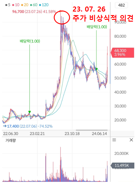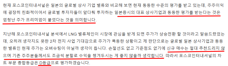 포스코인터내셔널의 경우 위와 같이 23. 07. 25에 주가 최고점에서 상식적이지 않은 주가라며 매도 하셔야 된다는 분석을 이미 드렸었던 종목입니다. 단순 기대감만으로 세계적인 수준의 주주환원률을 자랑하는 글로벌 일본 상사기업 밸류와 동일한 평가를 받는다는건 시장 논리상 절대 자연스러운 현상이 아니기 때문이었죠.