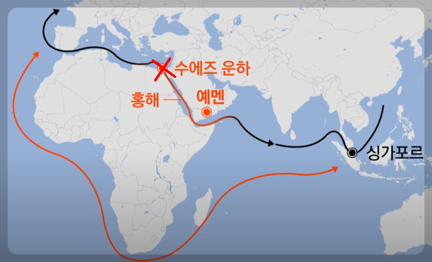 최근 코로나 팬데믹 사태 정도는 아니지만 중동발 지정학적 리스크로 해상운송의 핵심 운하인 수에즈 운하로의 이동이 어려워지면서 해운사들의 이동거리와 리스크는 비약적으로 증가해버렸고 이는 해상운임 상승으로 직결되고 있습니다.