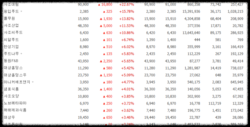 제가 이전에도 여러번 말씀드렸지만 개별 종목 장세보다 섹터 전체가 상승할 때 상승추세가 강하고 오래갈 확률이 높다고 말씀드렸습니다. 우호적인 시황으로 특정 섹터에 수급이 몰리면 섹터 내에서 수급이 돌면서 서로 주가를 이끌어주기 때문인데 지금 식품섹터도 섹터 전체가 뜨겁게 타오르고 있습니다.