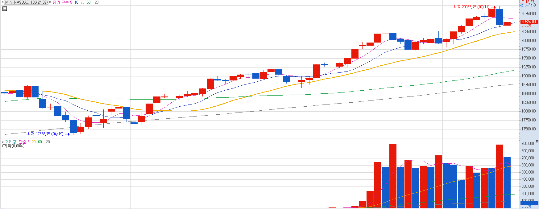 나스닥 9월물 선물 기준 나스닥은 5월부터 7월까지 무려 3,500 포인트를 상승하면서 새로운 역사를 매일매일 써내려가는 중이었죠.