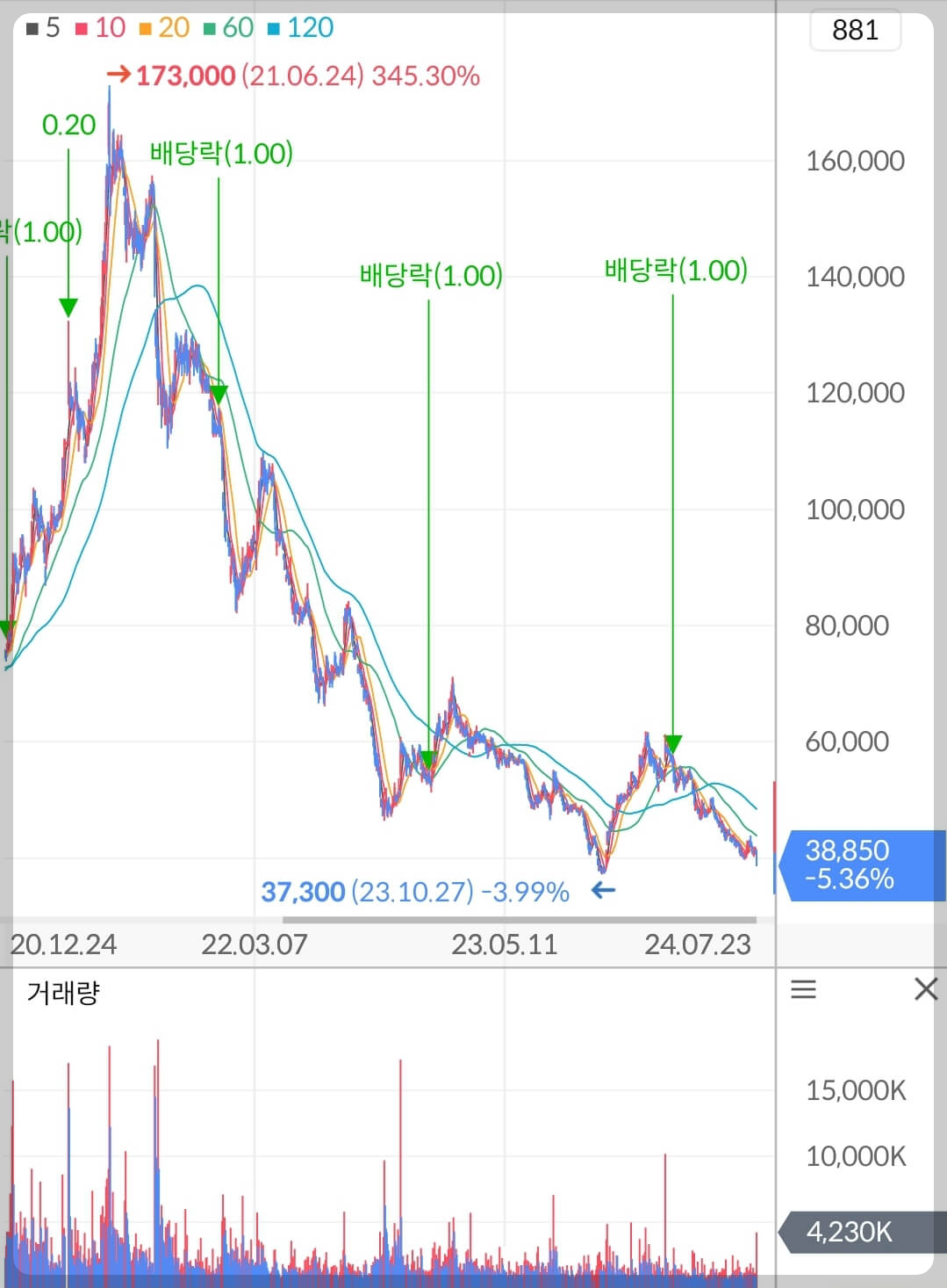 최근 발생한 악재로는 카카오의 김범수 위원장이 SM 인수당시 시세조종혐의로 구속된 것인데, 주주이익을 훼손하는데 그 어떠한 망설임도 거리낌도 없었던 기업에게 도덕적 선이라는게 있을리 만무합니다. 따라서 저는 개인적으로 전혀 놀랍지 않았는데 시장은 아무런 호재도 꿈과 희망도 없는 기업이 경영진 구속 악재까지 발생하니 투심이 악화되었습니다.