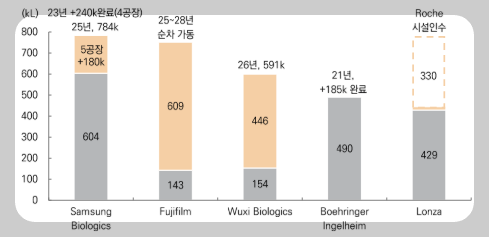 2025년 4월 5공장까지 준공된다면 전체 캐파 78.4만L로 향후 몇 년동안은 미국, 일본, 중국 등 글로벌 CDMO PEER들 중 세계 1위는 대한민국의 삼성바이오로직스가 차지할것입니다. 삼성바이오로직스는 GSK·얀센·머크·아스트라제네카·일라이릴리·화이자·로슈·노바티스 등 글로벌 빅파마 14개 기업들을 고객사로 확보하고 있으며, 최근에는 CMO PEER들의 공격적인 캐파 증설로 과잉공급에 대한 우려는 분명히 존재하지만 삼성바이오로직스의 강점인 항체치료제 수요는 꾸준히 성장할 것으로 예상됩니다.