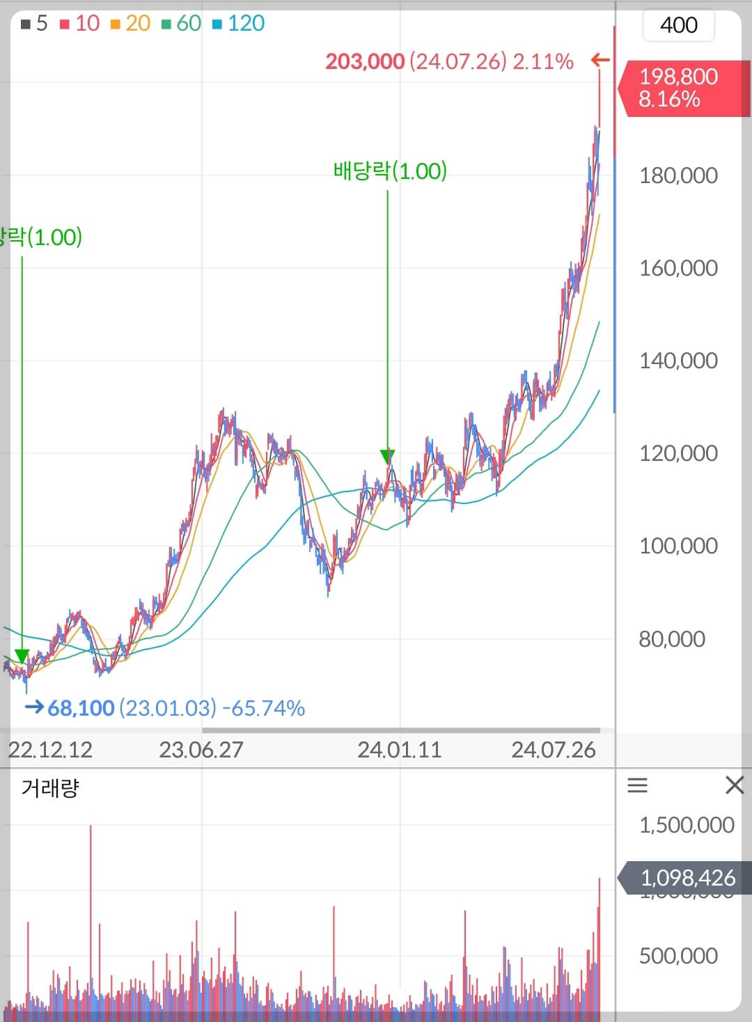 이미 52주 신고가를 돌파하며 매물대를 다 잡아먹고 외국인 지분이 30%를 초과하며 공격적인 수급이 유입되고 있기에 목표가를 정하는 것이 크게 의미는 없다고 생각합니다. 기존 주주분들께서는 거래량이 터지며 꼬리없는 장대음봉이 나오거나 일봉상 이평선의 데드크로스 등 고점 시그널이 나오기 전까지는 그냥 보유하시면서 시세를 충분히 즐기시면 됩니다. 그런데 지금 추격매수하시는 분들은 시그널이 나오게 되면 손실구간에 진입하기 때문에 당연히 더욱 타이트하게 운영하셔야겠죠.